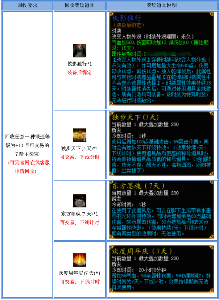 2、需要交付的7阶主法宝必须为锻造+10且可交易(带有转移时间也不影响回收),已绑定的或者非锻造+10的无法参与本次活动;