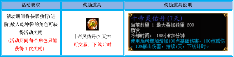 2、必须是在活动期间将侠影独行(进阶)放入乾坤袋才符合要求,非本次活动期间放入的无法获得奖励;