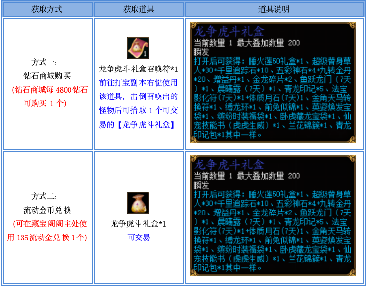 2、【龙争虎斗礼盒召唤符】仅限钻石商城购买,通过摆摊购买、互相交易、邮件领取、拍卖购买等非钻石商城购买方式获得的,均不计算在活动内;