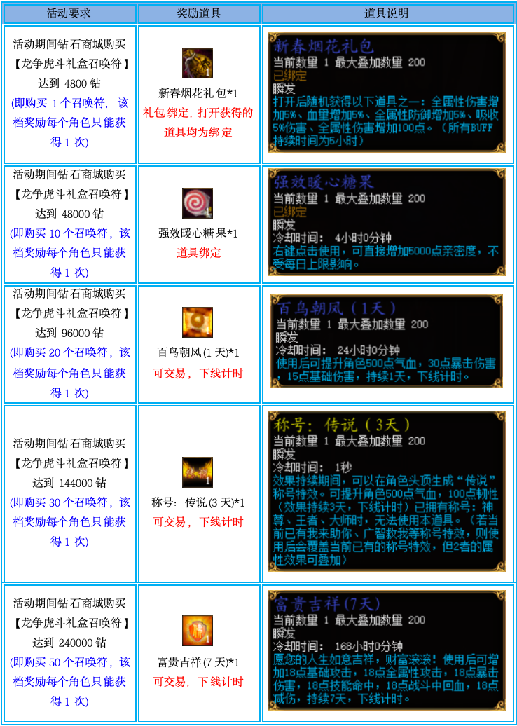 活动期间,单个角色在钻石商城累计购买【龙争虎斗礼盒召唤符】达到指定要求的钻石数量后可获得活动奖励,但每档奖励只能获得1次(请注意:金币购买礼盒无法参与本活动)