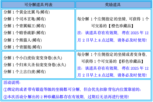 2、活动结束后,本次指定的道具将无法再进行分解,请有需要的玩家抓紧时间参与;