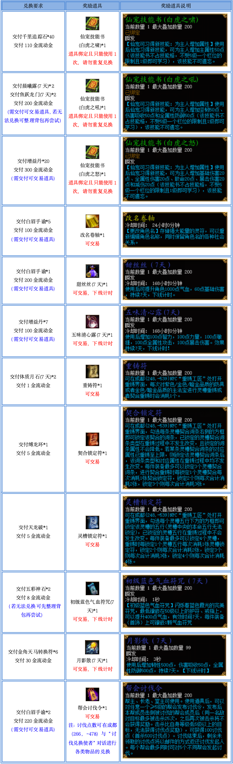 2、兑换获得的道具中,除【白虎之啸】、【白虎之吼】、【白虎之怒】这三本技能书为绑定,其余道具均可进行交易;