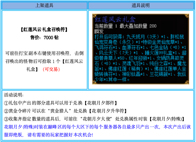 活动期间,钻石商城限时上架【红莲风云礼盒召唤符】,有需要的玩家可以前往购买,活动结束后即下架!
